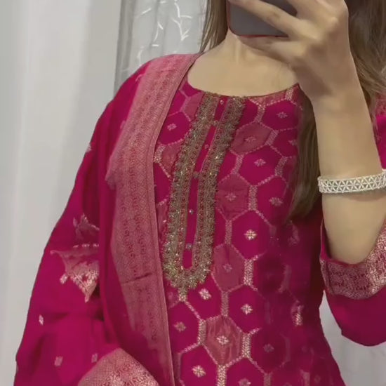 Featuring Beautiful Suit Sets in pure Banarasi Suit Set Top pent with duppta with jcard wiving, it is beautifully decorated desgins prints and hand zari wiving Jequard with Handwork Nack