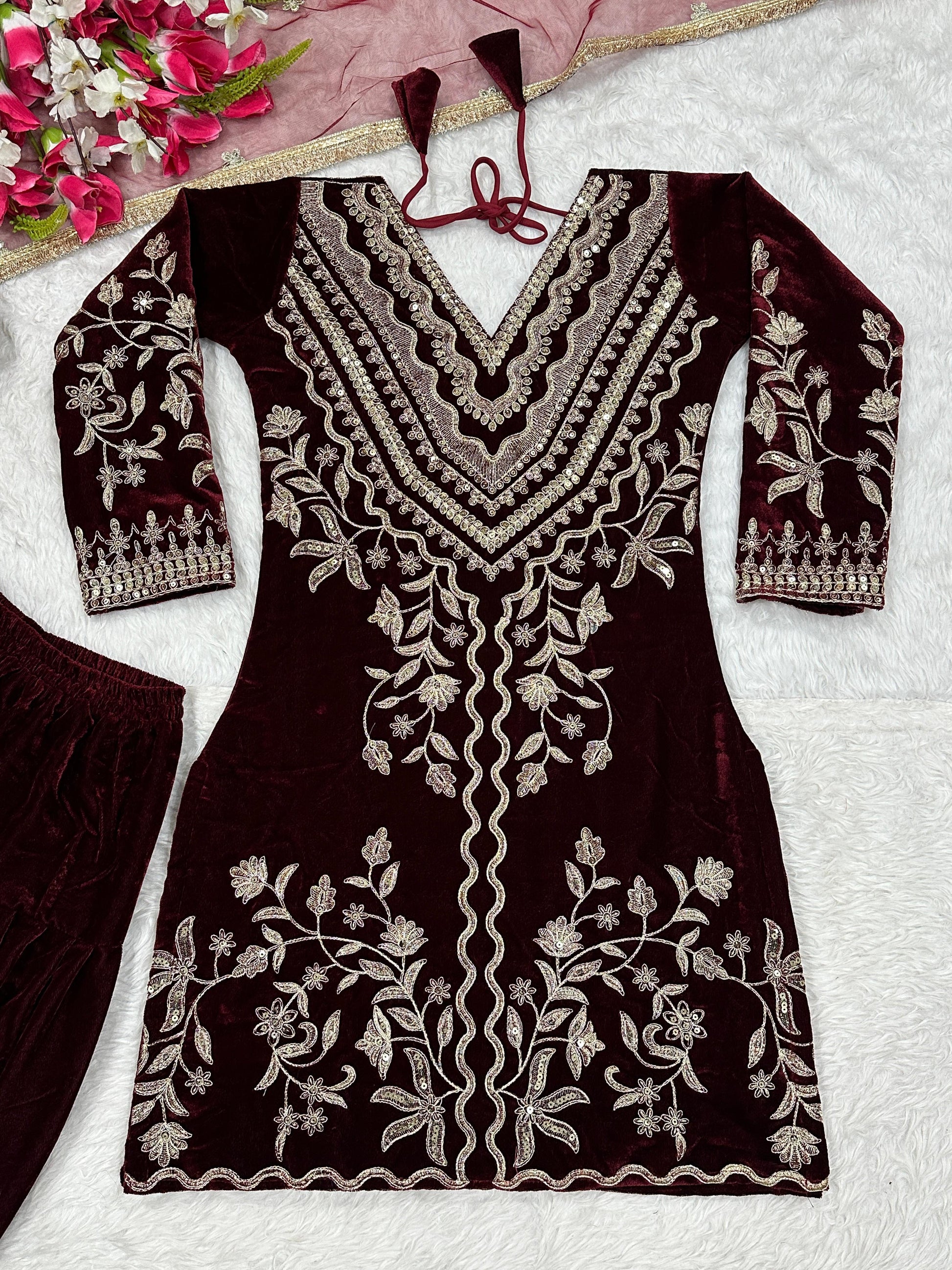 💃Top Fabric : pure heavy viscous velvet with heavy Embroidery multi Needle sequence work With . (Fully Sleeves)